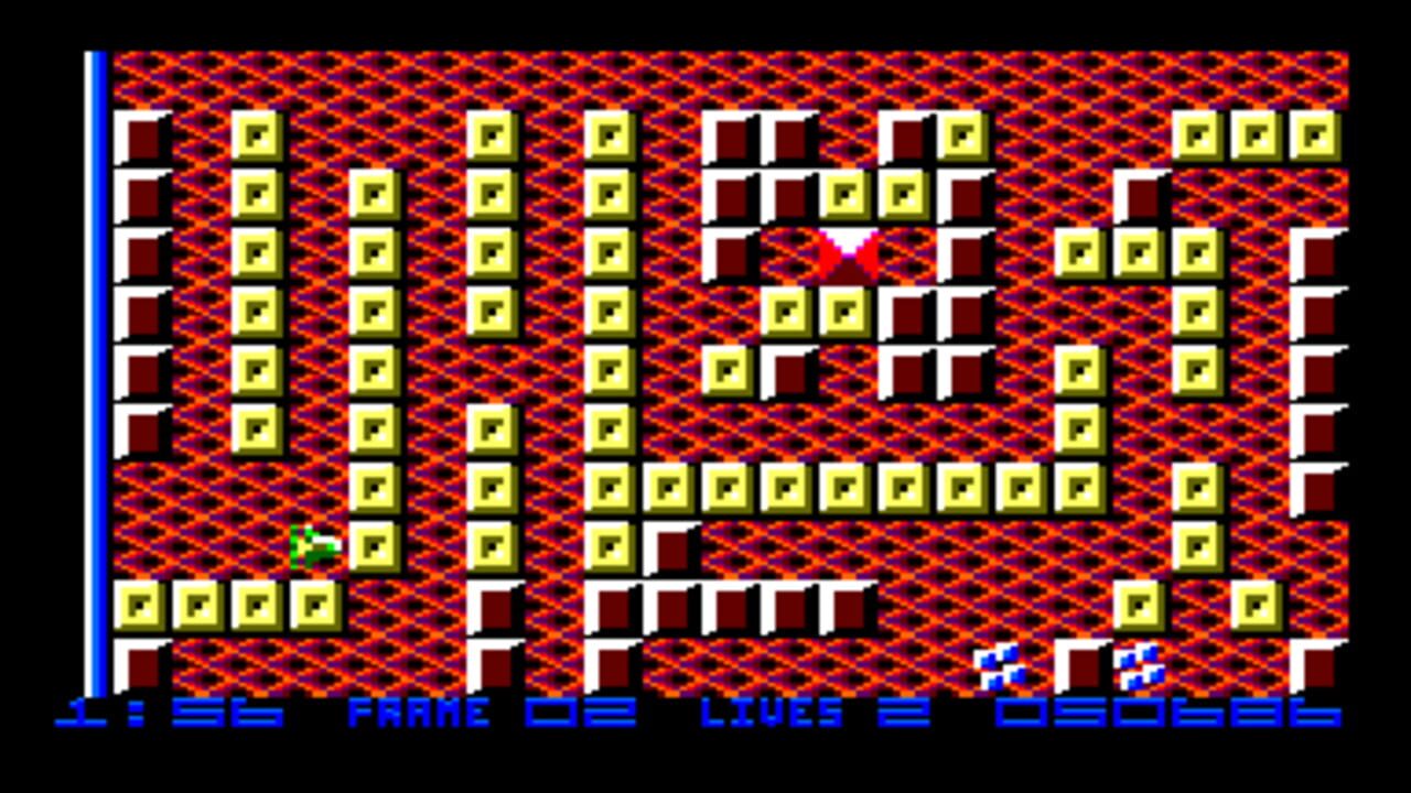 Çeviriliyor…Viewed from above in levels with simple sideways scrolling, the objective on each level is to shoot each of the weapons crates, before going through the newly-opened exit. Guard droids must be avoided, but shooting them can leave them inactive for a short period of time, and they can now be shot or hit to push them in that direction, which can be used strategically to make more paths available. There is a 2-minute time limit on each level. Every 5th level has a nuclear weapon guarded by a seeking enemy droid, which continually follows you.