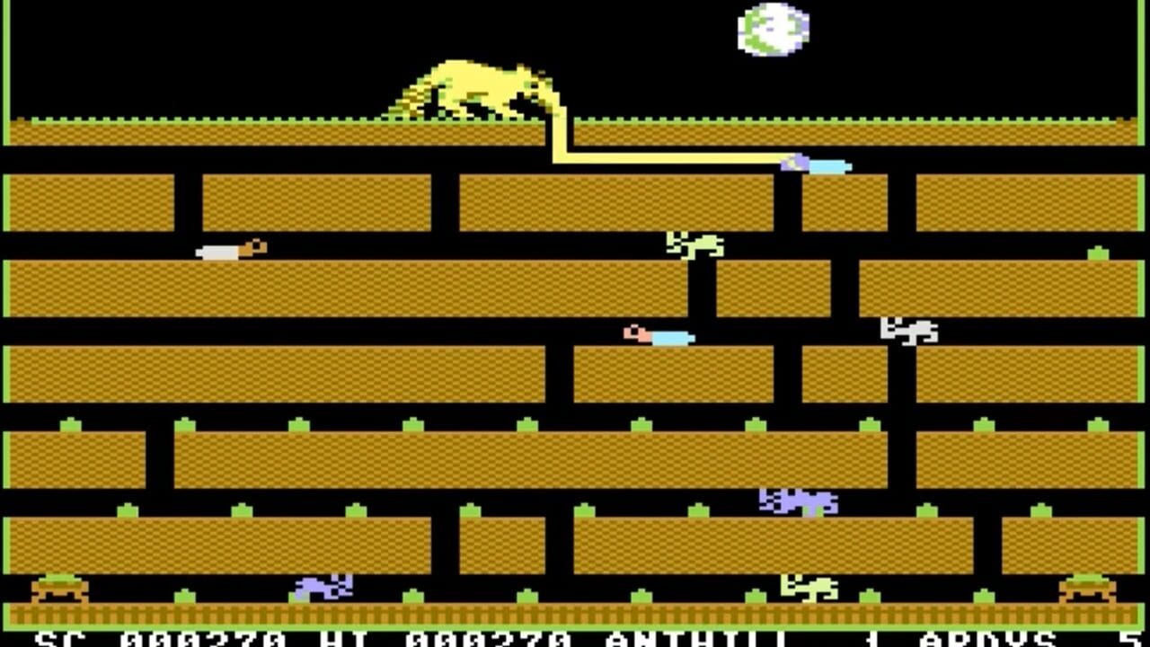 Çeviriliyor…A action maze-game based on the coin-op Anteater in which the player controls the tongue of Ardy the aardvark through an underground maze trying to eat drops of food and to evade worms, stinging ants and spiders.