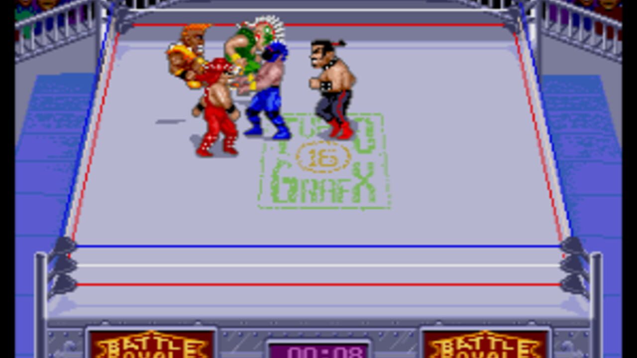 Çeviriliyor…It's wrestling mayhem out of control! Five maniacs hit the mat in a no-holds-barred, free-for-all brawl with no rules, no refs and absolutely no mercy! Team up with friends to nail opponents. Now look out! They're coming after you! Smash 'em, bash 'em and throw 'em over the ropes! The sound is so intense you'll feel every crushing hit, every cracking bone. It's furious, non-stop action for up to five players ... a winner-take-all gang fight for survival!