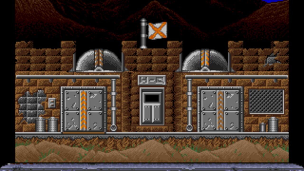 Çeviriliyor…This side-view shoot 'em up involves trying to retrieve two nuclear weapons which have been stolen by terrorists. These are located at opposite ends of the playing area, so you can pursue them in either order. Needless to say, the terrorists have plenty of forces out to prevent you getting too far. Unusually, the game features both a helicopter and a tank - you choose either from the base, and can fly/drive back there to change. The best strategy is to use the helicopter to shoot out air-based enemies and repair the various bridges, then return for the tank. You get 4000 seconds in which to complete all this, and losing a life costs you 500 of these.