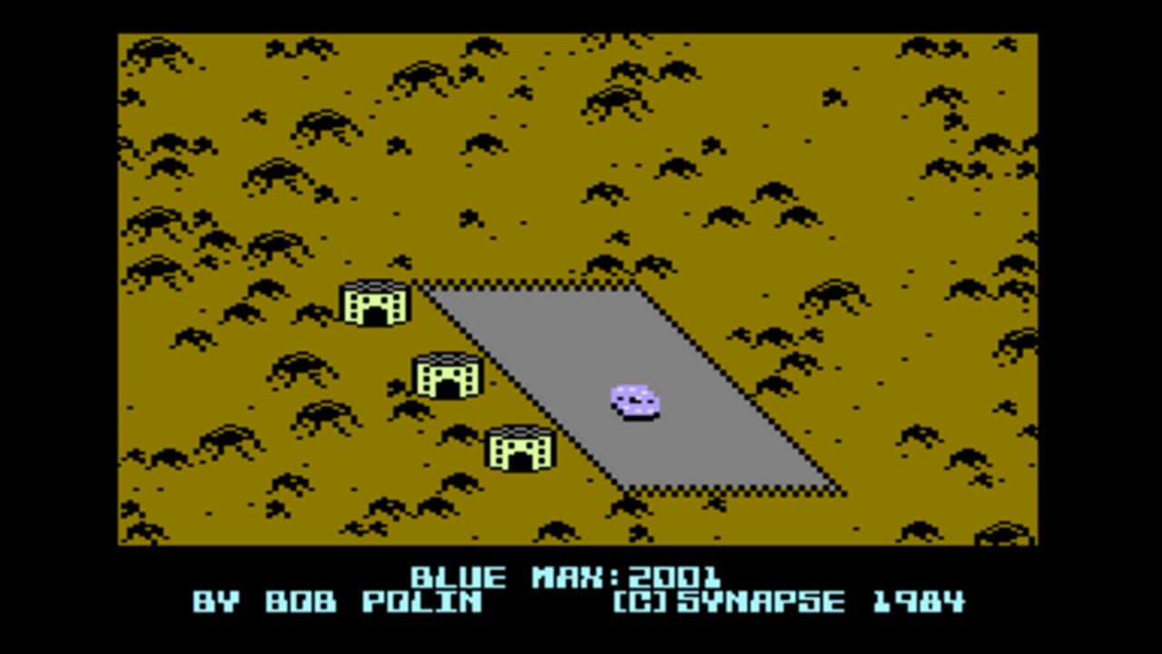 Çeviriliyor…In this sequel to Synapse's Blue Max, it is the year 2001 and you are flying a flying saucer. You're trying to bomb enemy targets while not getting shot (or rammed) by enemy saucers or shot by ground cannon. If the screen border starts flashing yellow, you are dangerously close to the ground. If the border is red, you are hitting the ground. If the border is gray, you are flying low but not TOO low. If the border is light blue, then the enemy ship is a the same altitude as you.