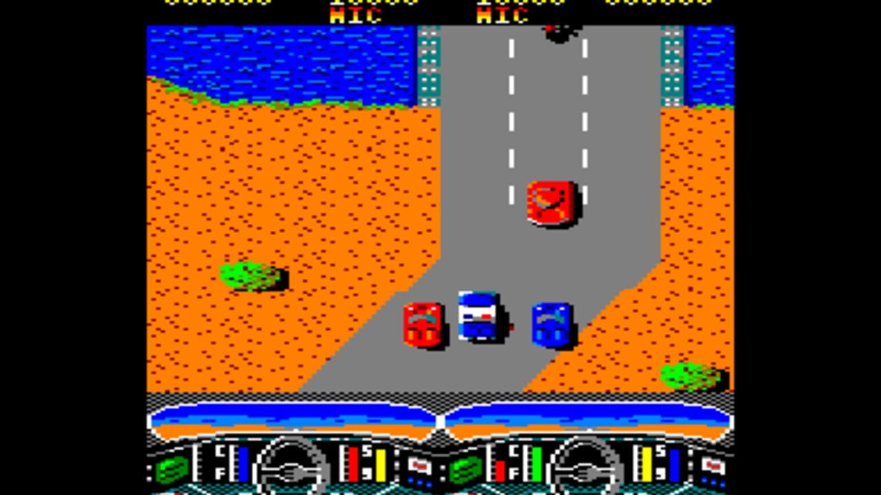 Your car is seen from above and moves along a roadway which scrolls from top to bottom of the screen. As you barrel down the blacktop the opposition moves in for the kill mounted on bikes or piloting anything from little yellow taxi cabs to Sherman tanks.