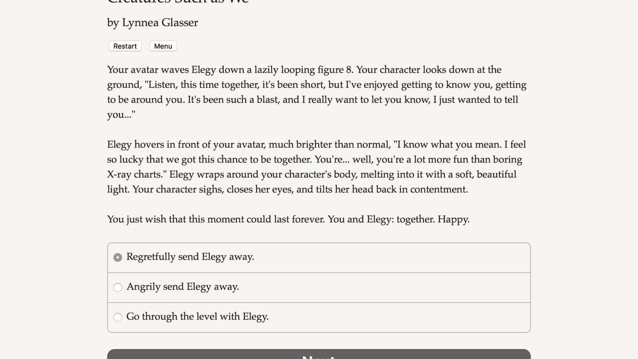 Çeviriliyor…Creatures Such as We is a philosophical interactive romance novel by Lynnea Glasser, where your choices control the story. It's entirely text-based and fueled by the vast, unstoppable power of your imagination.