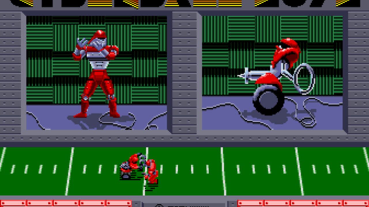 Çeviriliyor…Cyberball is an Atari Games arcade game of 7-man American football, using robotic avatars of different speeds, sizes, and skill sets set in the year 2022. The game replaced the standard downs system with an explosive ball that progresses from "cool" to "warm", "hot", and "critical" status as it is used. Players can only defuse the ball, resetting it from its current state back to "cool" by crossing the 50 yard line or by change of possession, whether through touchdown, interception or fumble. A robot holding a critical ball while being tackled is destroyed along with the ball. The robots also possess finite durability. As offensive units are tackled, they wear down, finally issuing smoke and then flames after a number of hits. A flaming robot will explode when hit, thereby fumbling the ball. Players can upgrade robots with faster and more durable units using money bonuses they earn during play. Players select from run, pass or option plays on offense, after which the computer presents four individual plays from which to choose. On defense, a player can select short, medium or long defenses, and then select a specific defensive scheme.
