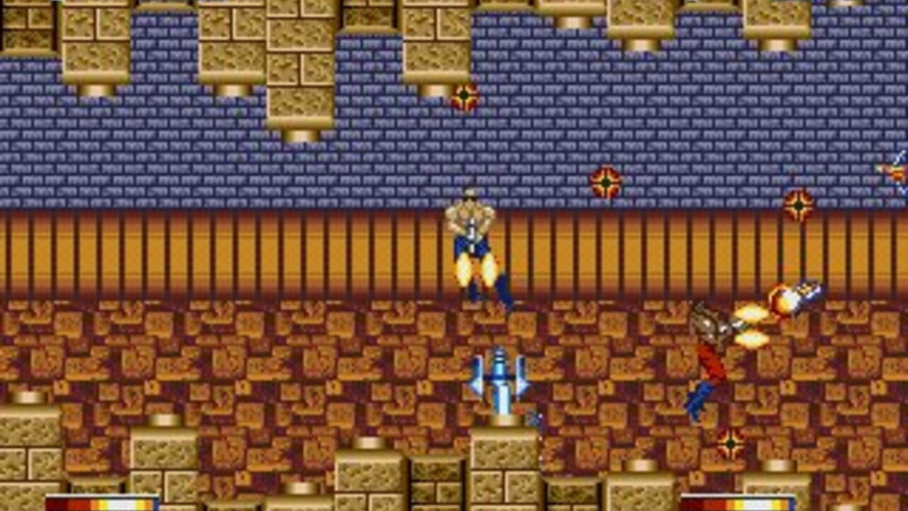 Çeviriliyor…Forgotten Worlds can be played by up to two players simultaneously. The player controls a flying muscle-bound soldier armed with a rifle with unlimited ammo. The Player 1 character is equipped with a long-range automatic rifle, while Player 2 has a short-range wide shot. The controls in the original coin-op version consists of an eight-way joystick for moving the character in the air while flying and a unique rotatable button known as the "roll switch".Rotating the switch left or right allows the player to adjust their character's aim in one of sixteen directions, while pressing it causes the player character to shoot his gun. This allows for the player to move their character anywhere while keeping their aim in one direction. Pressing the switch rapidly will cause the character to perform a "megacrush" attack will destroy all on-screen enemies, but at the expense of a portion of their vitality gauge.