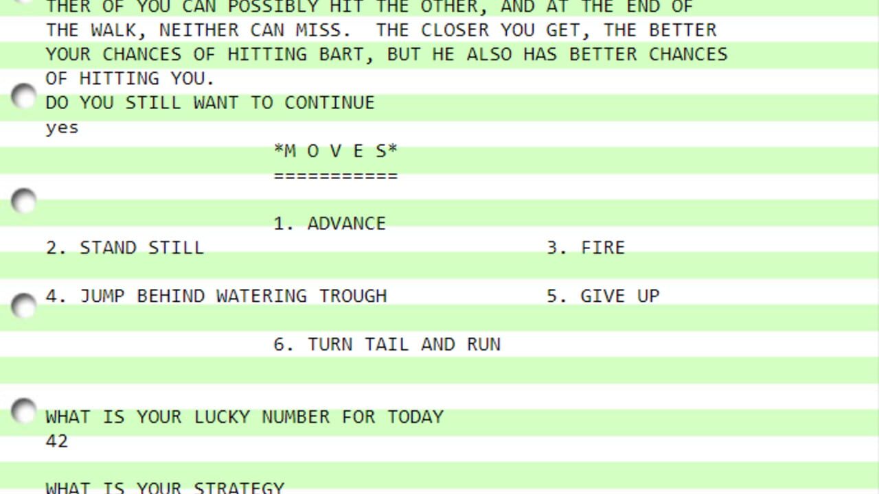 Çeviriliyor…Highnoon is a BASIC game developed by Christopher Gaylo from Syosset High School, New York in early 1970 on a timeshared mainframe computer. The game is single-player and set in the Wild West in 1889.