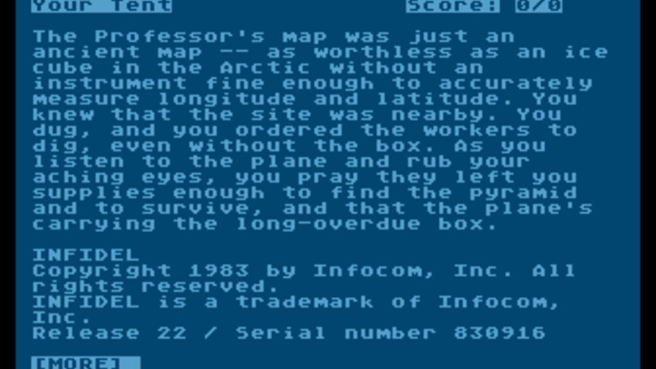 Çeviriliyor…Infidel is an interactive fiction computer game published by Infocom in 1983. It was written by Patricia Fogleman and Michael Berlyn and was the first in the "Tales of Adventure" line. Due to Infocom's virtual Z-Machine, it was ported to a wide variety of popular computing systems of the day, including the Apple II and Commodore 64. It is Infocom's tenth game.