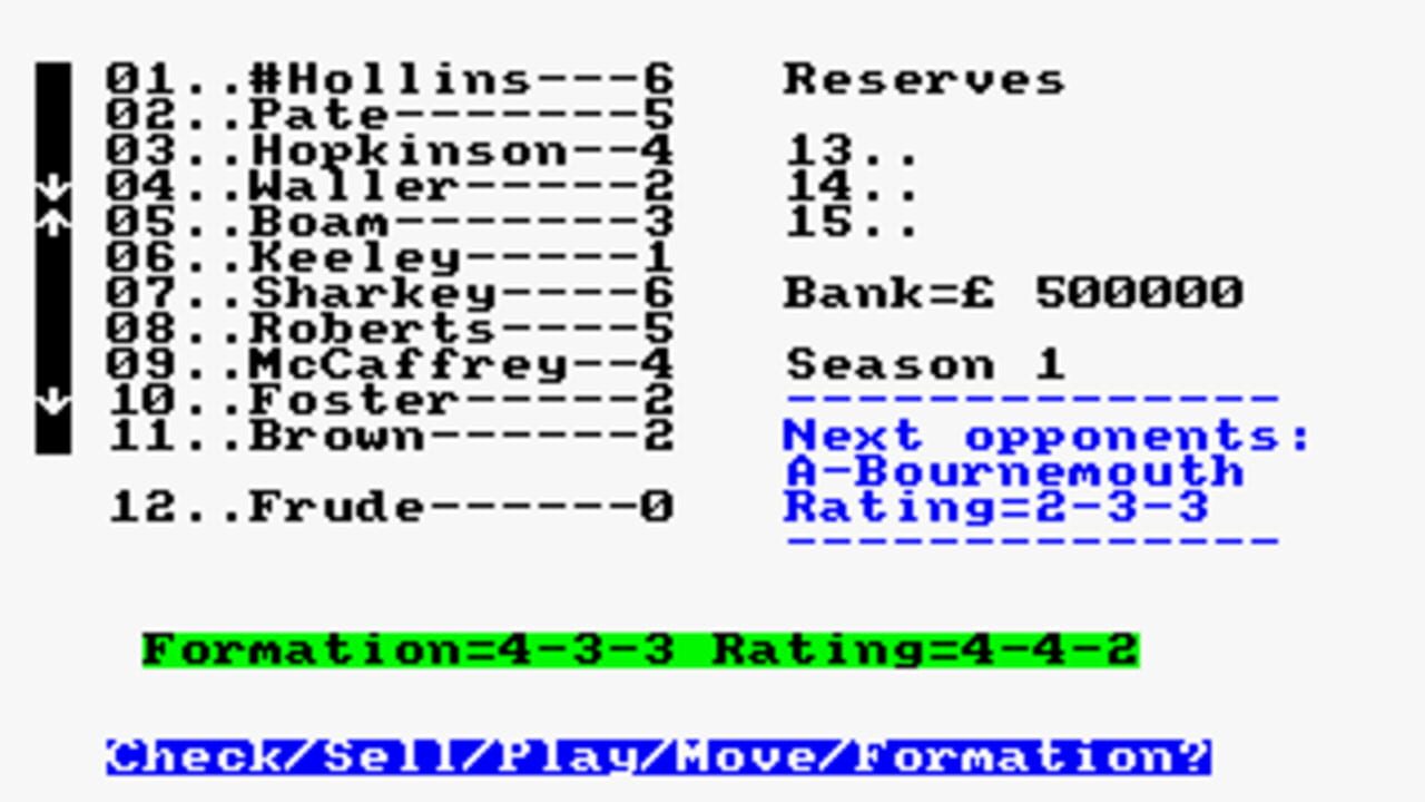 The team's formation can be customised, and as outfield players are not limited to a single position, you can customise the team's strengths and weaknesses in quite a precise way. Matches are played out by listing scorers as they happen, and are followed by a full list of the division's other results. Finances change after each match to wages, gate receipts, and possible incidents such as riots and illegal player approaches.